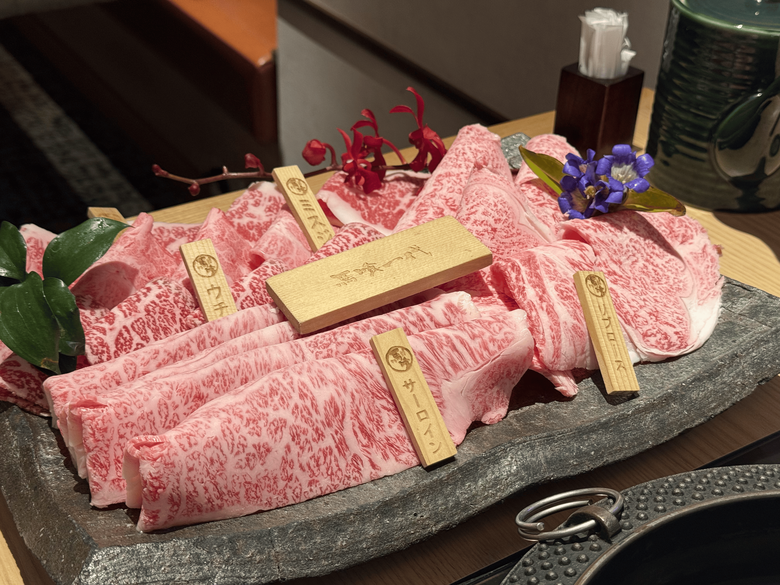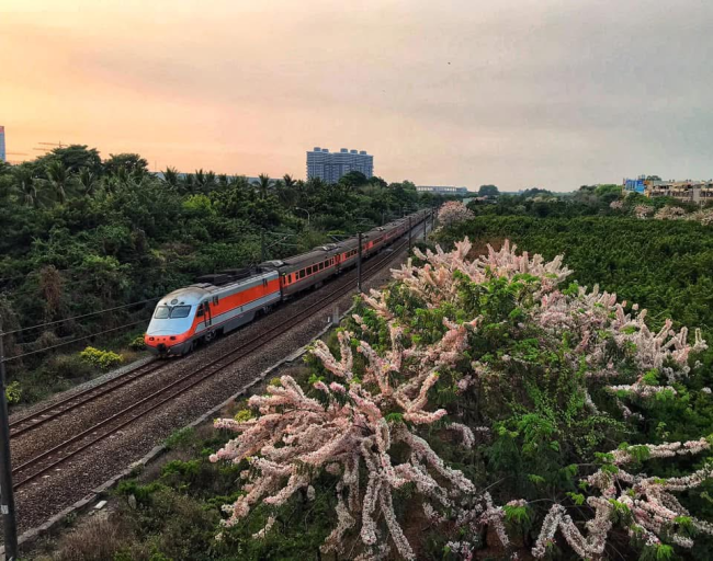 夕陽餘暉灑落在鐵道與周圍盛開的花旗木上