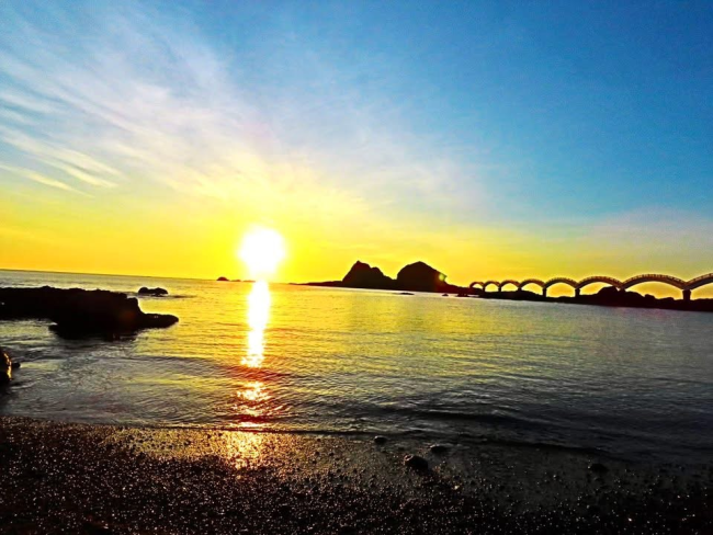 站在拱橋上,看太陽從太平洋的海平線緩緩升起,整片天與海交織成金橘色的夢境。
