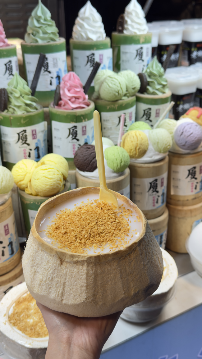 去廈門曾厝垵逛的時候、看到蠻多攤位都在賣這個椰子蛋,很好奇到底是什麼。 結果吃完驚為天人,白色那個是超濃郁的椰子果凍,感覺應該是椰子水+椰肉做成的果凍,再搭配上面的脆脆,簡直絕配😂
