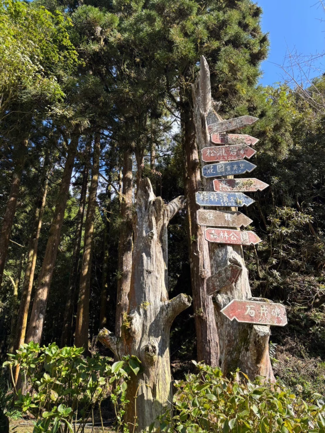 斑駁的木牌上,寫著「花園育英堡」、「松瀧瀑布」、「石井館」等地名,有的模糊、有的斷裂,卻更添幾分探險的神秘感。