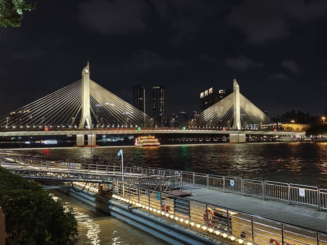 橋梁如弓、燈光如絲,倒映在珠江上閃爍生輝。