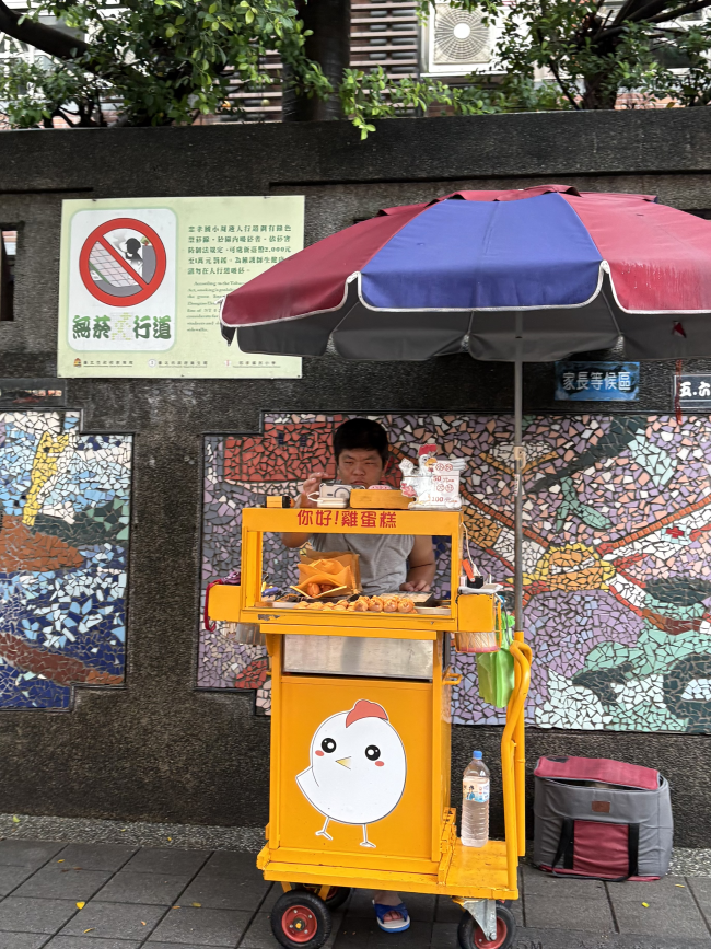 小小的黃色推車,上面寫著「你好!雞蛋糕」,圓圓的雞仔圖案像是在對我眨眼。
