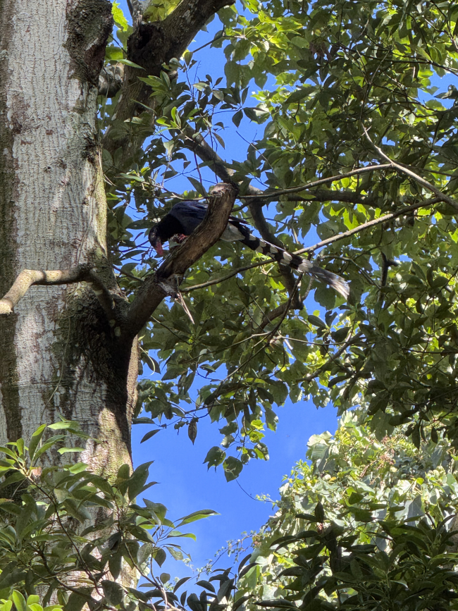 這次我造訪了天上山步道,這條步道位於新北市三峽與鶯歌交界處,是許多健行愛好者與自然觀察者的熱門去處。天上山以其良好的步道設施、四季變化的景色與豐富的生態聞名,沿途可欣賞到壯闊的山景與遠處城鎮的風貌。步道難度適中,適合大多數人前來健行,同時也是親近大自然、舒緩壓力的好地方。 其中最令我驚喜的,是在途中抬頭發現了樹枝上棲息的一隻台灣藍鵲。牠的羽毛呈現深藍與黑色交織的色澤,長長的尾羽在陽光下格外醒目,正低頭專注啄食著果實。台灣藍鵲是台灣特有種鳥類,被譽為「森林裡的藍寶石」,也是臺灣生態多樣性的代表之一。能在自然環境中近距離看到牠的身影,對我來說是一次難得的經驗。 天上山步道不僅有宜人的山林景色,更有機會邂逅珍貴的野生動物。如果你喜歡健行、觀鳥或單純想遠離都市喧囂,這裡絕對是值得一來的景點。