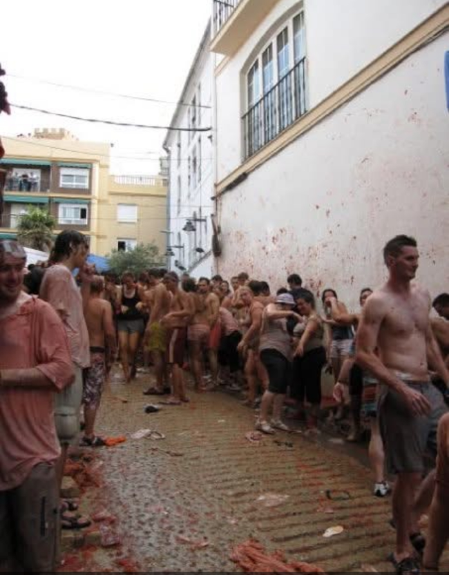 西班牙的番茄節la tomatina, 當初商人為了消化過多番茄而想出的節慶,真的很瘋狂,但也可能因為西班牙人玩耍時很認真所以節慶的瘋瘋的,亞洲男比較容易成為目標所以記得不要穿太好的T-shirt去,因為眼睜睜看著兩個以上被扒衣服其中有人非常生氣,西人可能不知自己玩過火,因為他們也會對自己人這樣,但可能常被整所以都不太會生氣。印像中番茄車進來是很迅速地一下就結束,且是硬的,被打到其實很痛,是要等車子過後大家去撿地方的泥開始亂丟才好玩,像極了大小孩在地上滾來滾去,也會有英雄救美的跑出來保護女生呵,節慶比想像中的更快結束但開始前的氛圍畢竟是小鎮大活動,所以會醞釀個好幾天,且鄰居們都會提供免費的水幫遊客沖洗。但這幾年參加開始要收費了。